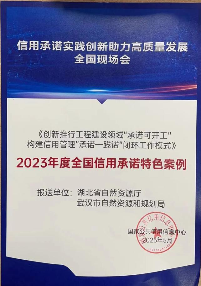 2023年5月11日,國(guó)家公共信用信息中心組織的信用承諾實(shí)踐創(chuàng)新助力高質(zhì)量發(fā)展全國(guó)現(xiàn)場(chǎng)會(huì)上,武漢市自然資源和規(guī)劃局申報(bào)的《創(chuàng)新推行工程建設(shè)領(lǐng)域“承諾可開(kāi)工”構(gòu)建信用管理“承諾—踐諾”閉環(huán)工作模式》獲評(píng)2023年度全國(guó)信用承諾特色案例。