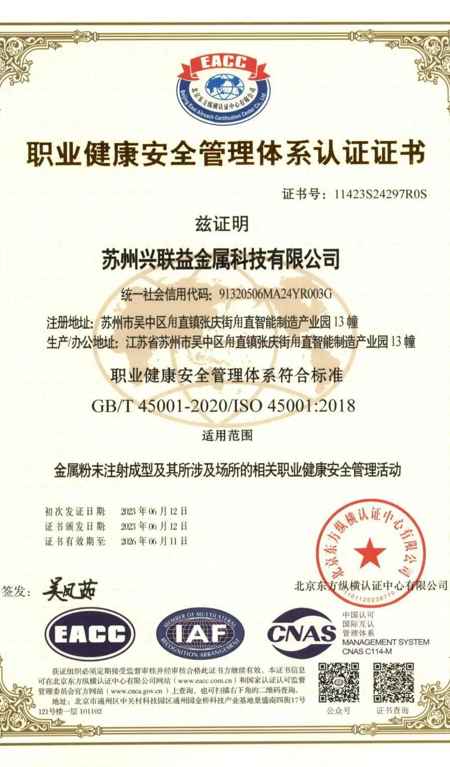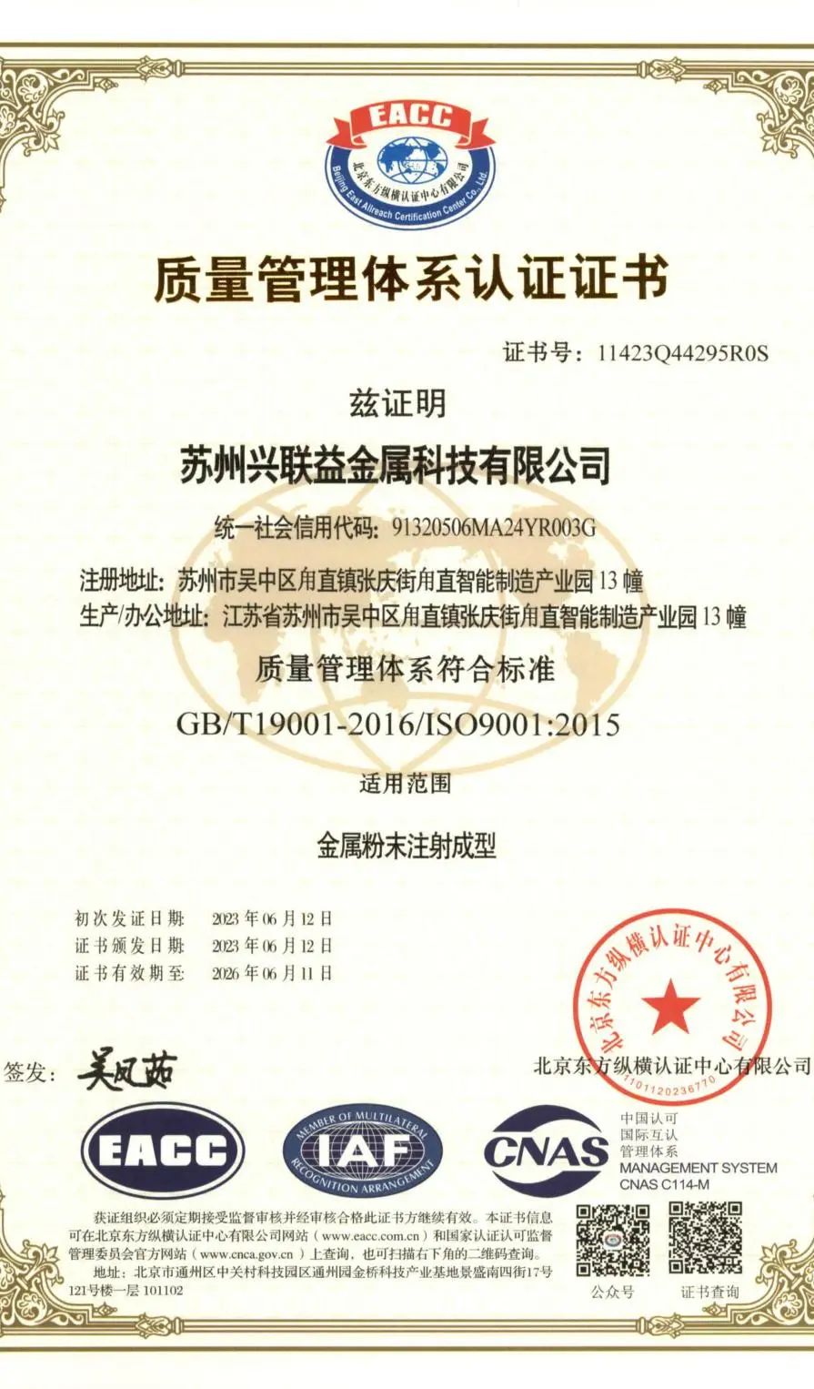 興聯益作為一家專注MIM(粉末冶金)制品研發與制造的生產型科技企業。截止目前,企業已建立了現代化產品生產基地、引入了國內先進的生產設備:密煉機、注射成型機、脫脂爐、燒結爐、整形機、CNC、研磨加工、清洗線等MIM全制程配套以及輔助設施,打造滿足客戶需求的精益化制造體系。公司先后通過了ISO9001:2015版質量管理體系認證、ISO14001:2015版環境管理體系認證、ISO45001:2018版職業健康安全管理體系認證,以及IATF16949汽車質量管理體系認證。