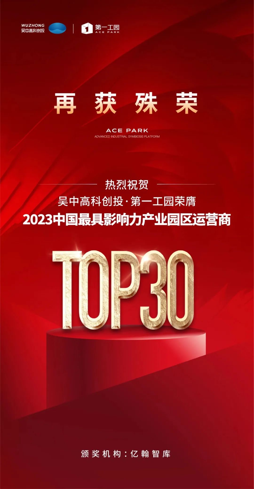 正是因為吳中高科創投·第一工園在新時代變局之下始終保持產業戰略定力,不斷實現跨越式發展,并積極拓寬產業賽道,最終榮膺2023中國最具影響力產業園區運營商TOP30,展現了卓越的品牌價值。