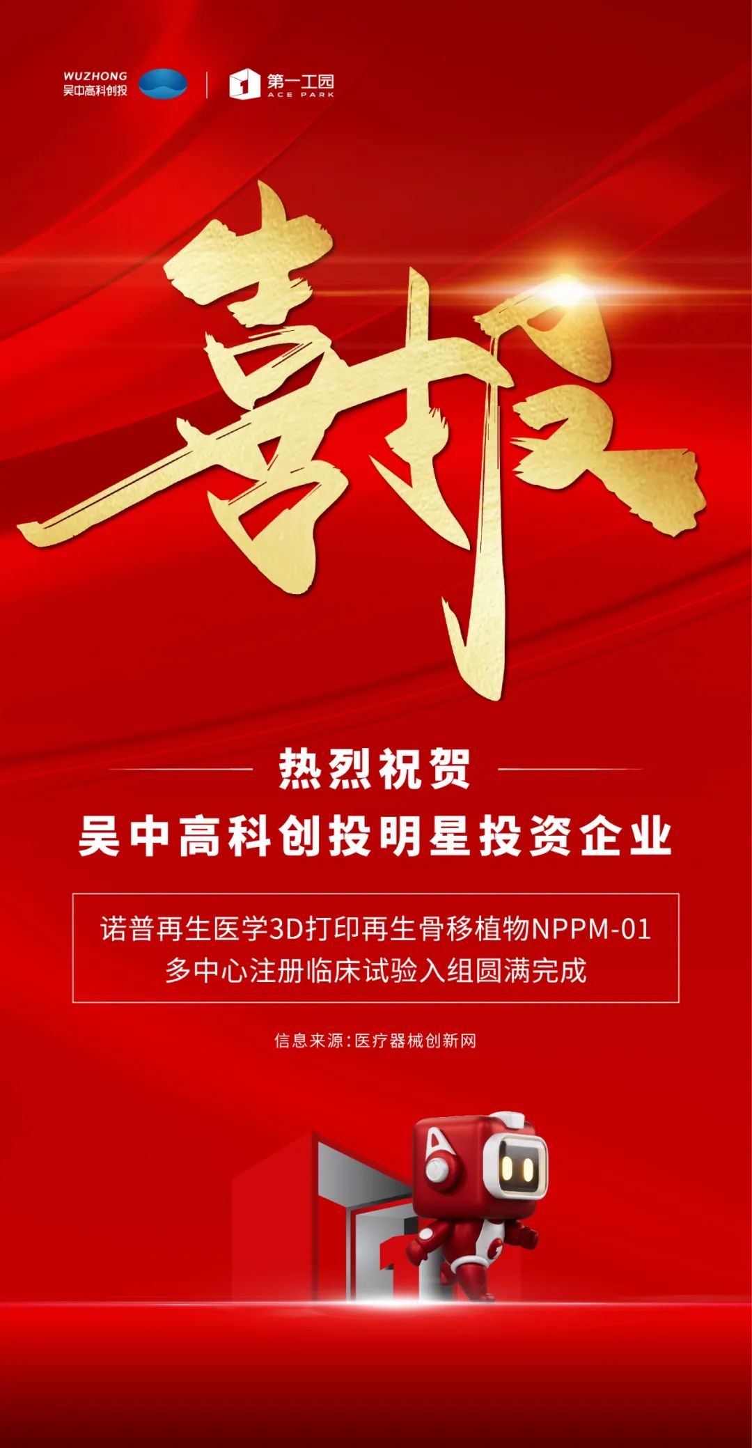 2021年,在第一工園園區載體的支撐下,吳中高科創投朝著企業投融資方向大步邁進,攜手國內醫療器械投資頭部機構元生創投,完成了對國家高新技術企業、國際領先的生物3D打印技術企業—蘇州諾普再生醫學有限公司的A輪投資。
