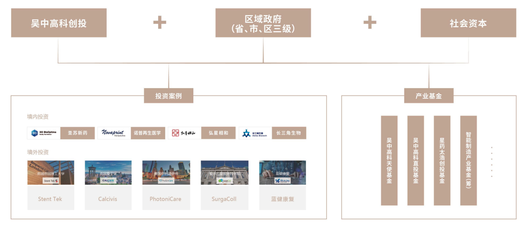 吳中高科創投按照“產融結合”的發展思路,與區域政府、金融機構、投資機構展開全方位深度合作,設立吳中高科天使基金、吳中高科直投基金、星藥太浩創業投資基金等,瞄準有技術有市場的高成長性企業、“專精特新”企業等,投資帶動并引導特色產業項目落地。截至2022年底,已在境內外投資多個創新型項目,并以專業的投資和深度的服務,助推了圣蘇新藥、諾普再生醫學、弘星相和、長三角生物、Stent Tek、Calcivis、PhotoniCare、SurgaColl、藍健康復等眾多明星企業快速成長,也成就了吳中高科創投優異的業績。